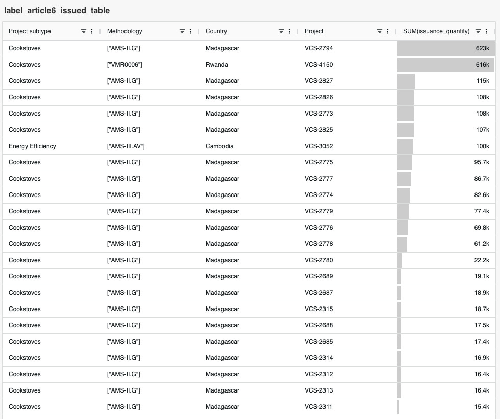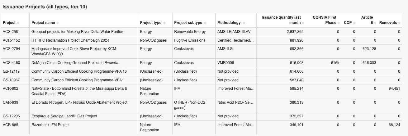 ・Article 6ラベルの情報を提供しているのは、VCSおよびGSのレジストリのみです。以下は、2025年10月にクレジットが発行されたプロジェクトの上位10件と、ラベル(Article 6、CCP、CORSIA、Removal)が発行された案件リストです。