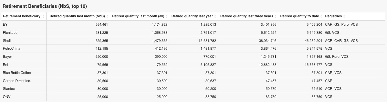最も多くを償却した企業はイギリスのプロフェッショナル・サービス事業であるEYで、その数量は55万ユニットでした。同社はこれまで、REDDおよび自然再生案件に累計292万ユニットを償却しています。その中には、インドネシアの大規模プロジェクトであるKatingan案件(VCS-1477)やウルグアイのGuanaré案件(VCS-959)も含まれています。
