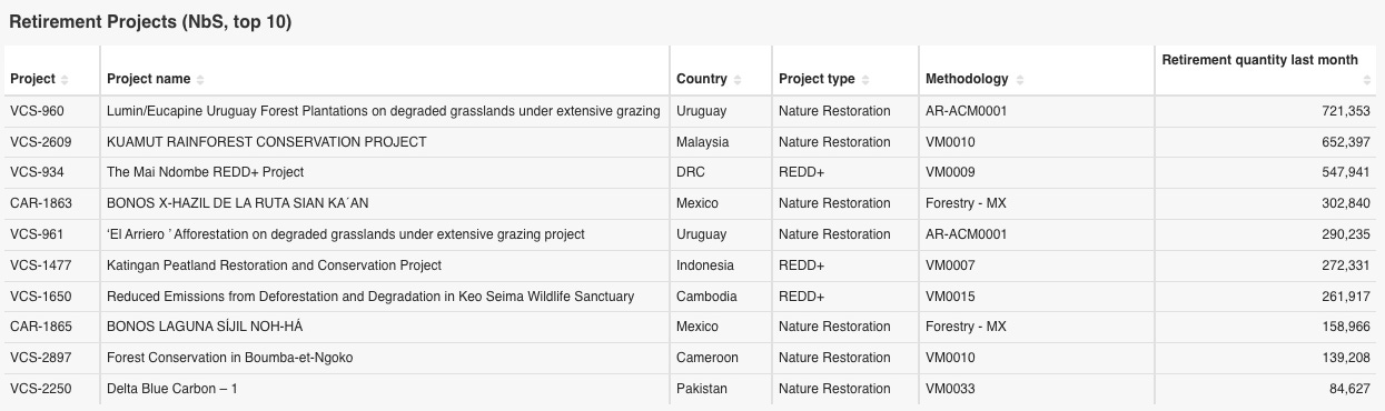 2025年10月に最も多く償却されたトップ10の自然由来プロジェクトの一覧は以下の通りです。