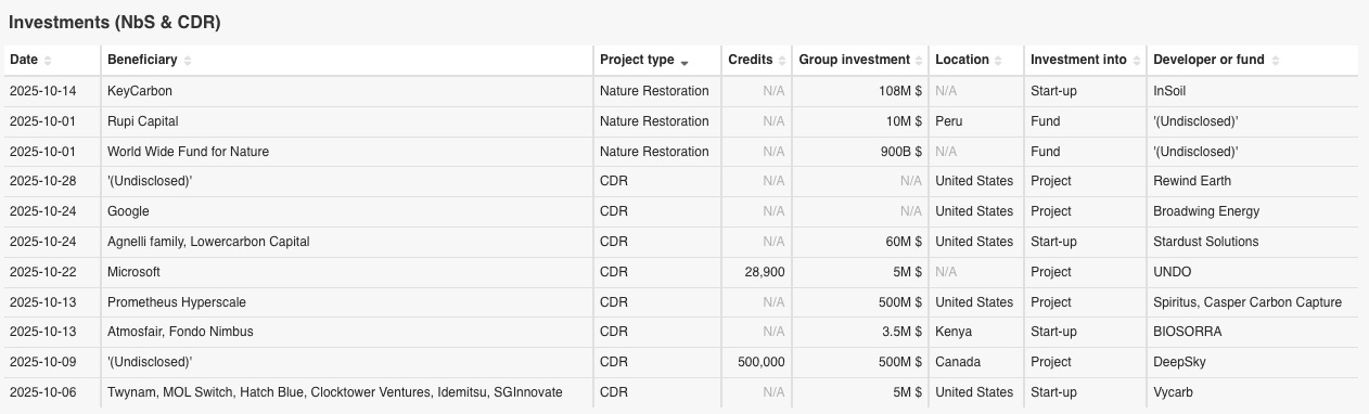 - 留意事項: 「クレジット量(Credits)」や「投資額(Group investment)」については、発表された数字のみを記録しているため、空欄がある場合があります。また、この表でのBeneficiaryとは、投資をした企業やクレジットを購入する側の企業を指し、Investment intoとは、投資対象がプロジェクトなのかファンドなのかを示しています。10月には、自然由来とCDRのプロジェクトへの重要な投資が11件ありました。こちらの内容については、A-3: 詳細解説セクションをご覧ください。