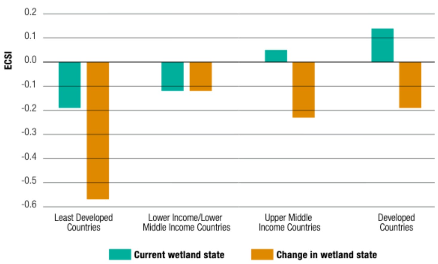 GWO2025はまた、国内報告書、学術研究、市民科学調査のデータを用いて生態学的特徴の動向を追跡し、残存する湿地の広範な劣化を記録しています。分析によると、改善している湿地よりも劣化している湿地の割合の方が高く、この傾向は2011年から2021年まで続いています。さらに、国の経済状況とその湿地の状態との間には直接的な相関関係が見られ、後発開発途上国では湿地の現状が最も悪い状態にあります(図1)。この調査結果は、湿地喪失の現在の主な要因が地域特有のものであることを示唆しており、先進国は歴史的にすでに湿地の大部分を失っている一方、開発途上国は現在進行中の経済発展により急速な劣化を経験しています。